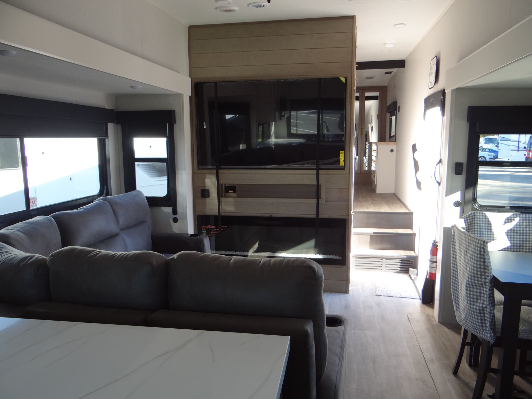 The Jayco Eagle 365UKTS features three expansive slide-outs, ingeniously maximizing the interior space to create a welcoming and open environment. Accommodating up to six people, this RV ensures that everyone can enjoy a restful night's sleep, thanks to its thoughtfully designed sleeping arrangements. The interior is adorned with high-quality finishes and modern amenities, ensuring a luxurious experience on the road. Whether you're preparing a meal in the fully equipped kitchen or unwinding in the spacious living area, every detail has been considered to enhance your journey.