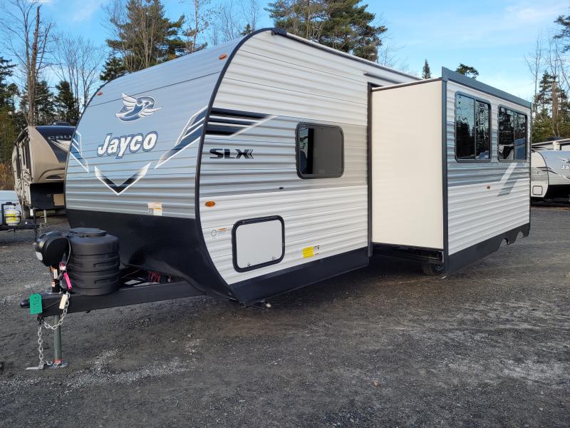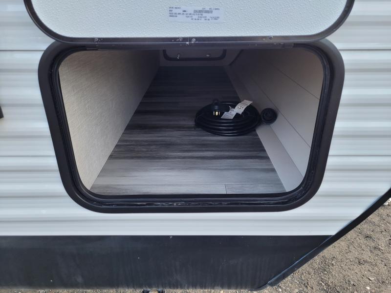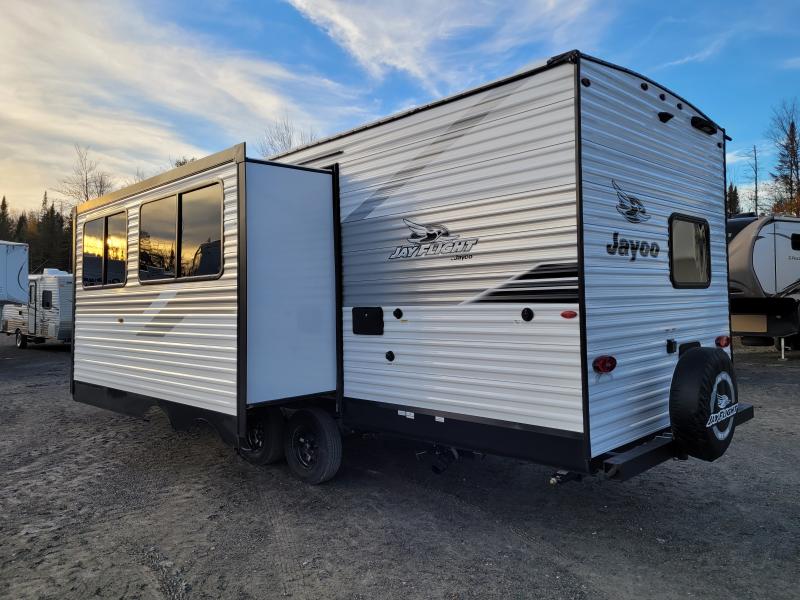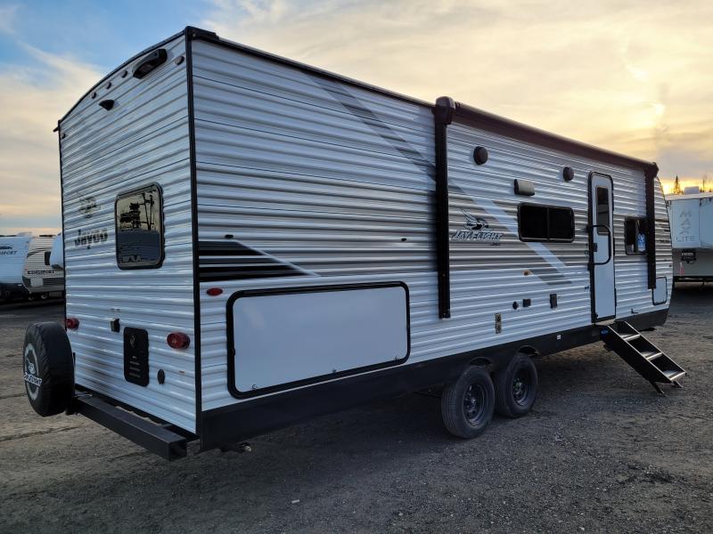 Inside, you'll find a thoughtfully designed layout that maximizes every square meter of space. The JayFlight 261BHS features a cozy sleeping arrangement with a queen-sized bed, double bunk beds, and a convertible dinette, comfortably accommodating up to eight people. The fully equipped kitchen boasts a three-burner stove, a microwave, and a refrigerator, ensuring you can prepare meals with ease. The bathroom is complete with a shower, sink, and toilet, providing all the conveniences of home while on the road.