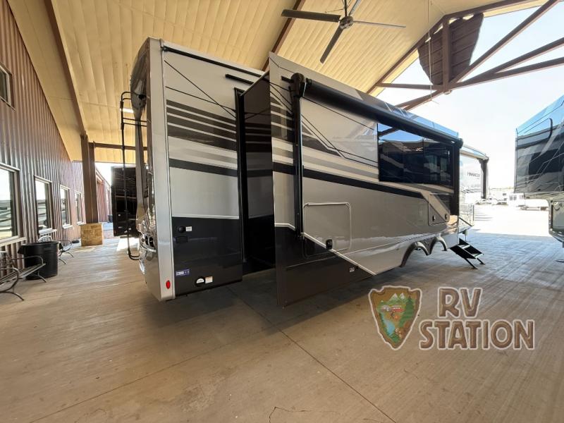 Featuring three slide-outs, the Jayco Pinnacle 38FBRK maximizes interior space, providing a roomy and inviting atmosphere. The RV comfortably sleeps four, with a master bedroom that promises restful nights and a convertible sofa for additional sleeping space. The well-appointed kitchen is equipped with modern appliances and plenty of storage, making meal preparation a breeze. The elegant living area, complete with plush seating and a state-of-the-art entertainment system, ensures that you can unwind in style after a day of exploration.