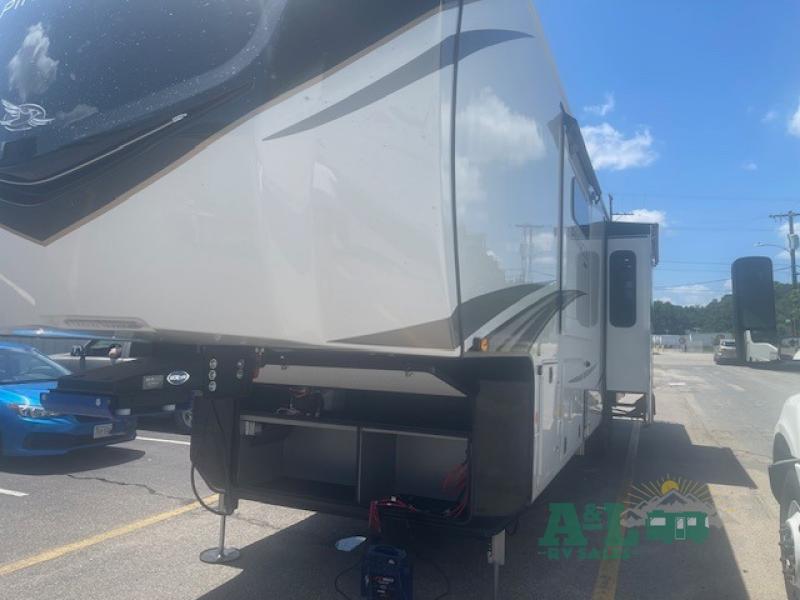 Inside, the Pinnacle 38FBRK comfortably sleeps four, ensuring a restful night's sleep after a day of exploration. The interior is thoughtfully designed with high-quality finishes and modern amenities, creating a cozy and inviting atmosphere. Whether you're cooking in the fully-equipped kitchen or unwinding in the plush living area, every moment spent in this RV is a pleasure. The smart layout maximizes space, providing you with all the comforts of home while on the road.