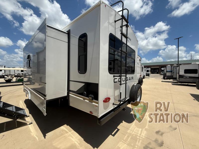 Step inside to discover a thoughtfully designed interior featuring high-quality finishes and modern amenities. The Cougar 29RLP boasts a fully equipped kitchen with a refrigerator, microwave, and three-burner stove, allowing you to prepare delicious meals on the go. The cozy living area includes a plush sofa and a dinette, perfect for relaxing or entertaining guests. The master bedroom offers a comfortable queen-sized bed, while the bathroom features a spacious shower and all the essentials for a refreshing experience.