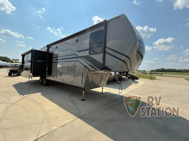 Step inside and be greeted by a spacious and inviting interior. The Montana 331RL features a beautifully appointed living area with plush seating and a cozy fireplace, perfect for unwinding after a day of exploration. The kitchen is a chef's dream, equipped with modern appliances, including a large refrigerator, microwave, and oven, all seamlessly integrated into the stylish cabinetry. With plenty of counter space and a convenient island, meal preparation is a breeze. The dining area comfortably seats four, making it perfect for family meals or entertaining guests.
