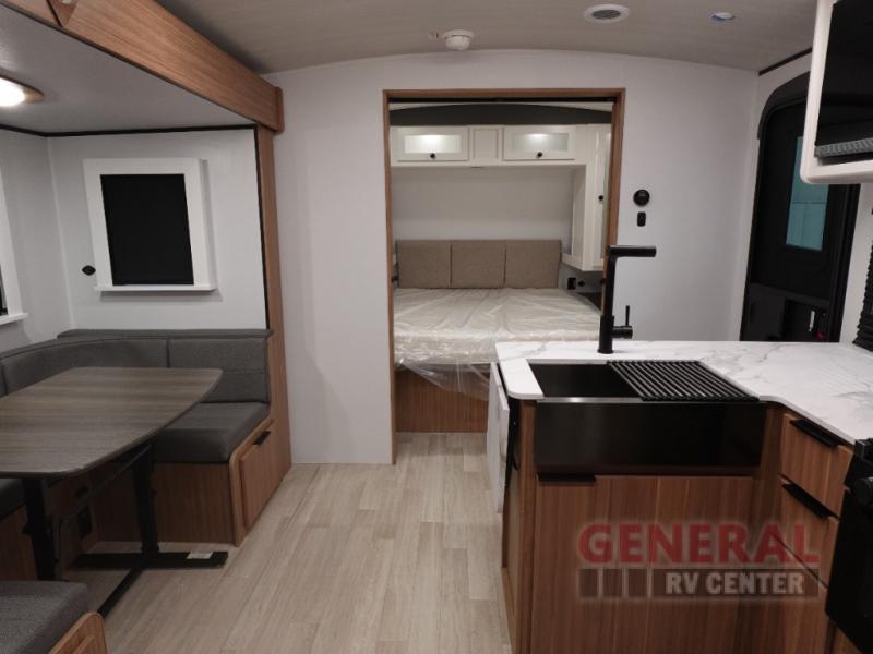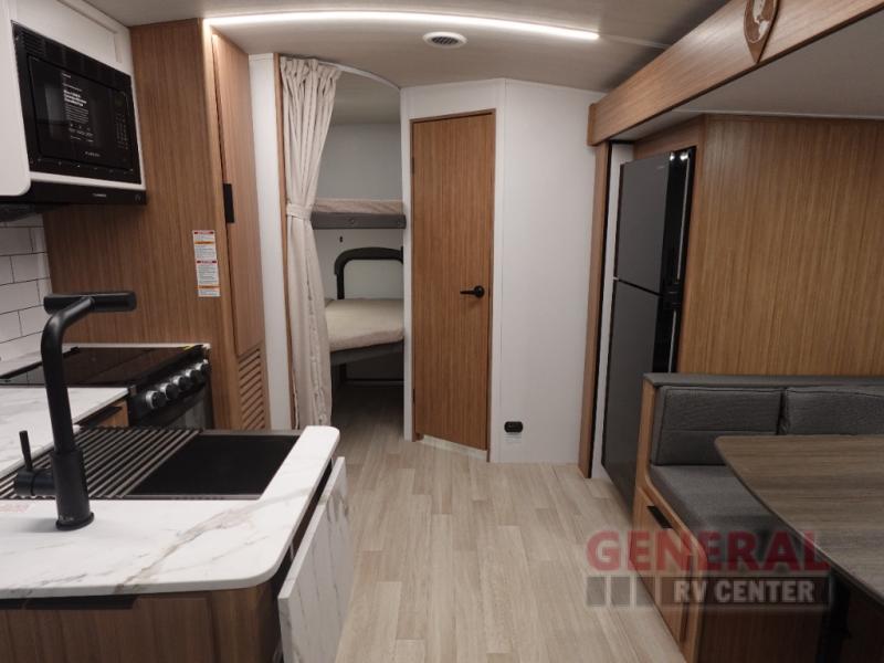 Inside, you'll find a cleverly designed space that can comfortably sleep up to 8 people. Whether you're planning a family getaway or a trip with friends, everyone will have a cozy spot to rest. The single slide-out expands your living area, providing extra room to relax and enjoy your time indoors. The interior is thoughtfully laid out with modern amenities and stylish finishes, ensuring you have everything you need for a comfortable stay.
