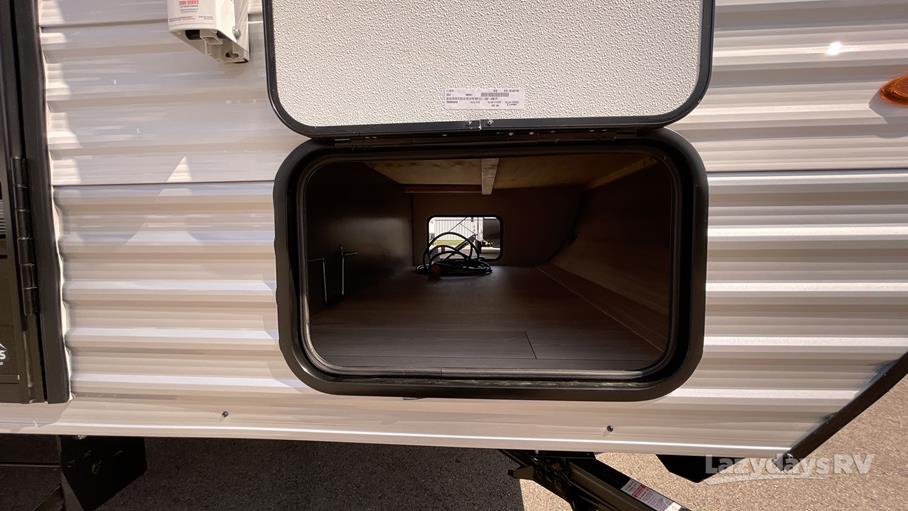 Step inside to find a thoughtfully designed interior that maximizes space and functionality. The 180BH model features a versatile sleeping arrangement, including a comfortable queen bed, bunk beds, and a convertible dinette, ensuring everyone has a restful night’s sleep. The well-equipped kitchenette comes with a refrigerator, microwave, and two-burner cooktop, allowing you to prepare delicious meals with ease. Ample storage solutions throughout the trailer ensure you can bring along all your essentials without compromising on space.