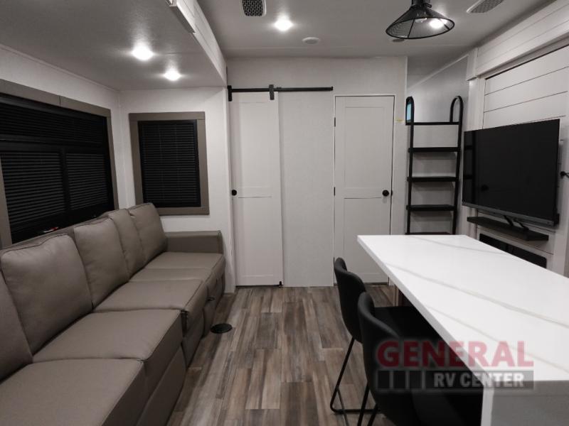 Step inside and be amazed by the generous living space, thanks to its four slide-outs that create a roomy and comfortable environment. Whether you're lounging with friends or hosting a family movie night, there's space for everyone. This RV can comfortably sleep up to eight people, making it perfect for family adventures or trips with friends. The well-designed interior includes a master bedroom, bunkhouse, and convertible sleeping areas, ensuring everyone gets a good night's sleep.