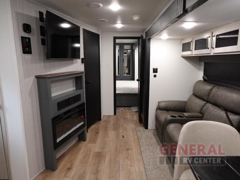 Step inside and experience the luxury of space with two slide-outs that expand your living area, providing ample room for relaxation and entertainment. The thoughtfully designed floor plan accommodates up to four sleepers, making it ideal for couples or small families. The front kitchen layout is both functional and stylish, featuring modern appliances and plenty of counter space for meal preparation. Whether you're cooking a gourmet meal or enjoying a quick snack, this kitchen is equipped to handle it all.