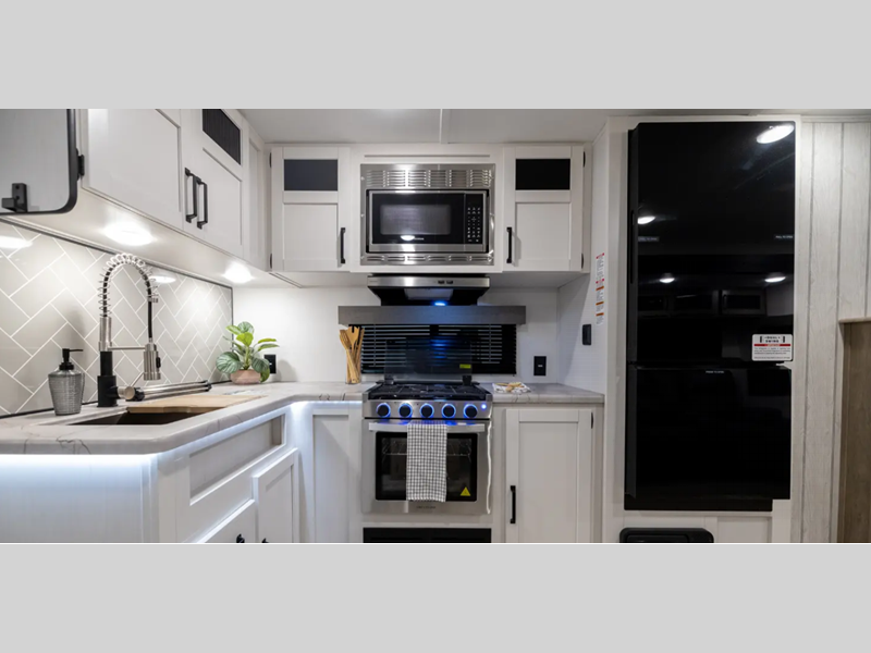 Step inside, and you'll be greeted by a roomy interior thanks to the two slide-outs that expand your living space. Whether you're lounging after a day of exploring or enjoying a meal, you'll appreciate the extra room. This trailer comfortably sleeps four, making it perfect for small families or couples who love to travel with friends. The master bedroom offers a cozy retreat, while the convertible dinette and sofa provide additional sleeping options.