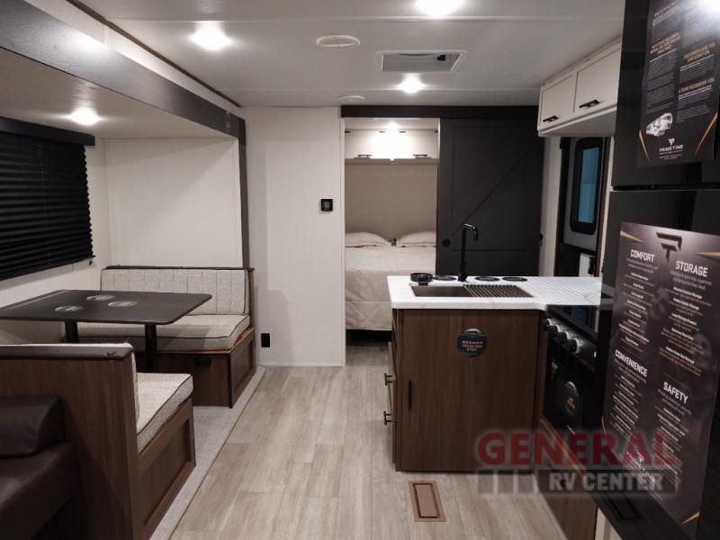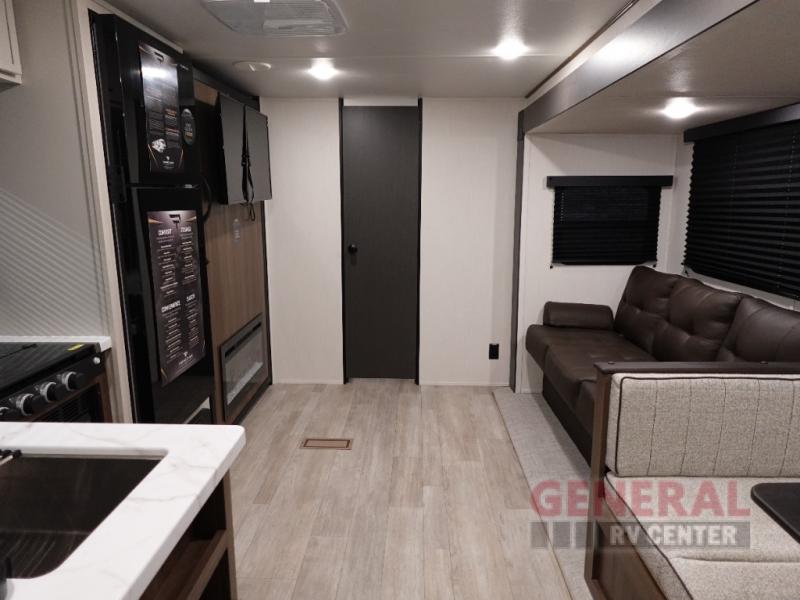 Measuring approximately 23 feet in length, this travel trailer offers ample space for relaxation and entertainment. The single slide-out expands the living area, creating a spacious and inviting atmosphere. Inside, you will find accommodations to comfortably sleep four, making it ideal for families or small groups. The thoughtfully designed interior features high-quality furnishings and finishes, ensuring a luxurious experience on the road. The well-equipped kitchen, cozy dining area, and comfortable sleeping quarters are all designed with your comfort in mind.