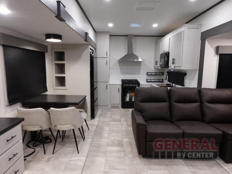 This fifth wheel boasts four slide-outs, significantly enhancing the living space and providing a roomy interior that comfortably accommodates up to four occupants. The intelligent design ensures that every inch of space is utilized efficiently, offering a harmonious blend of style and practicality. With a weight of approximately 6,335 kilograms, this RV is built with robust materials, ensuring durability and stability on the road. The Sanibel 38LAUNDRY is equipped with modern amenities and high-quality finishes, ensuring a luxurious experience for all travelers.