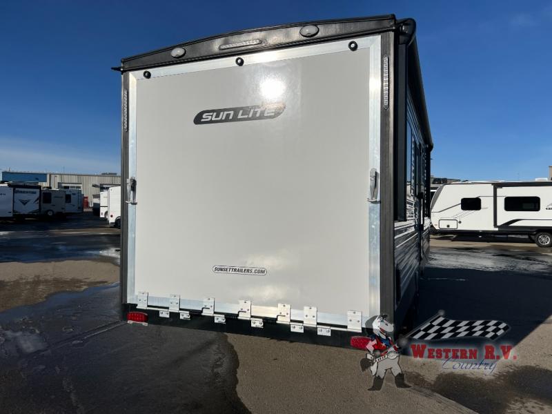 Introducing the 2026 Sunset Park RV Sun Lite 27WQB ToyHauler, a versatile and robust travel companion designed for those who seek adventure without compromising on comfort. This exceptional RV, measuring approximately 24 feet in length, is engineered to accommodate the needs of both thrill-seekers and families alike. With a sleeping capacity for up to five individuals, it ensures that everyone can rest comfortably after a day of exploration.