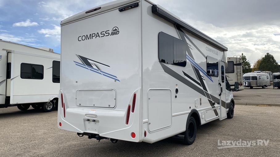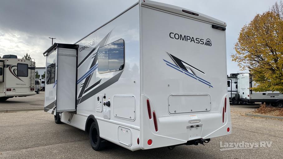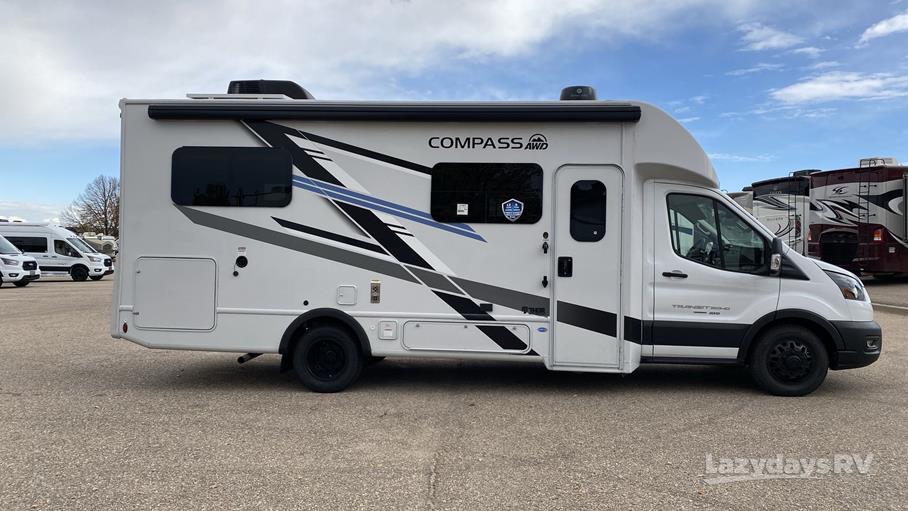 The interior of the Compass 24JG is thoughtfully designed to maximize space and convenience. Featuring one slide-out, this motorhome expands to offer a generous living area, perfect for relaxing after a day of exploration. The well-appointed kitchen comes equipped with modern appliances, ensuring you can prepare meals with ease. The sleeping area is designed for comfort, providing a restful retreat after a day on the road. Additionally, the bathroom is efficiently laid out, offering all the necessary facilities without compromising on space.