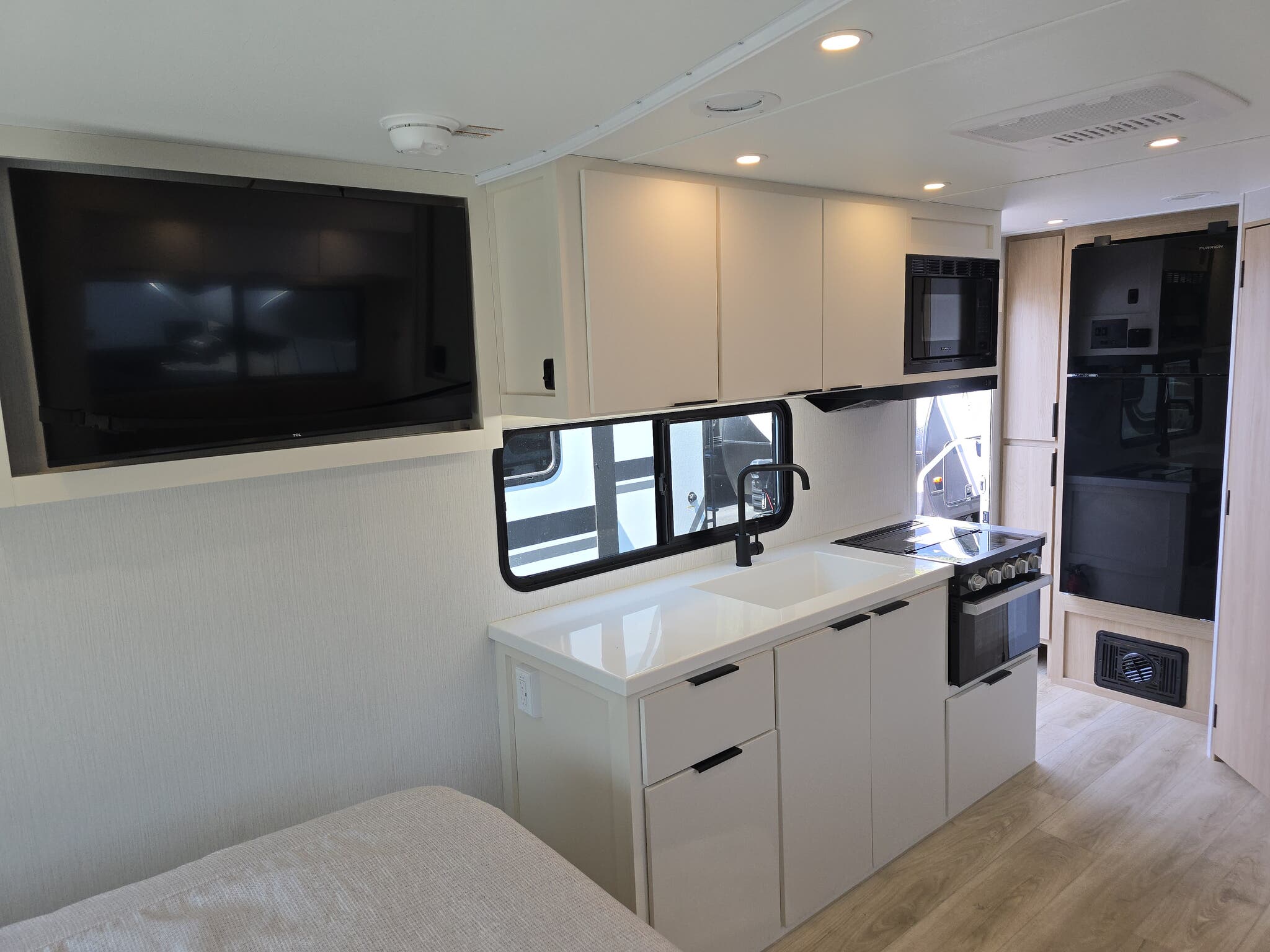 Weighing in at approximately 2,724 kilograms, the Winnebago Thrive 18FBS is easy to tow, allowing you to hit the road with confidence. Its smart design maximizes every inch of space, featuring a cozy sleeping area, a fully-equipped kitchenette, and a modern bathroom. The interior is thoughtfully crafted with high-quality materials and finishes, creating a warm and inviting atmosphere that feels like home, no matter where your travels take you.