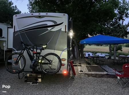 Step inside and be greeted by a thoughtfully designed interior that can comfortably sleep up to four people. The cozy sleeping arrangements include a plush queen-sized bed and a convertible dinette, ensuring restful nights after days filled with adventure. The well-appointed kitchen features a refrigerator, microwave, and stovetop, allowing you to prepare delicious meals on the go. Ample storage space throughout the RV ensures you can bring along all your essentials and more.