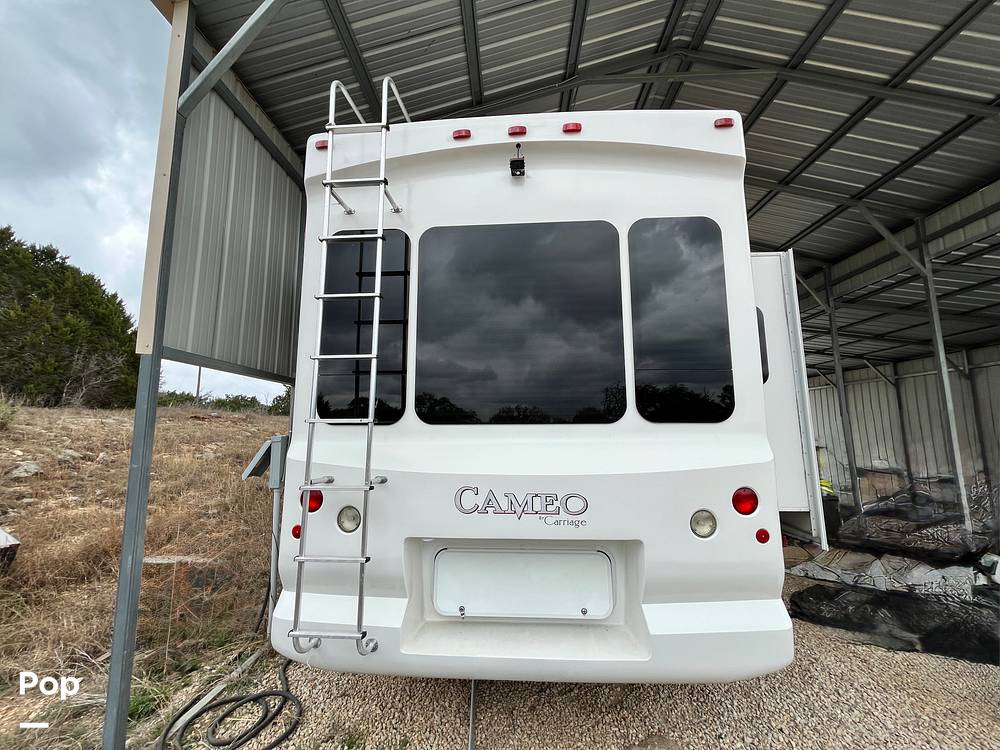 Measuring approximately 31 feet in length, the Carriage Cameo offers ample space without compromising on maneuverability. Inside, you'll find a well-appointed living area featuring plush seating and a fully equipped kitchen, complete with modern appliances and generous storage. The cozy bedroom provides a restful retreat, while the bathroom offers all the conveniences of home. Every detail has been considered to enhance your travel experience, from the elegant finishes to the practical layout.
