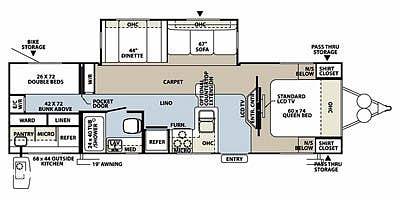 Step inside to find a thoughtfully designed interior that maximizes space and functionality. The living area is equipped with plush seating and a convertible dinette, providing a cozy spot for relaxation and meals. The fully-equipped kitchen features modern appliances, including a refrigerator, microwave, and stove, allowing you to prepare your favorite meals on the road. The sleeping arrangements are versatile, with a comfortable master bedroom, bunk beds, and additional sleeping options in the living area, ensuring everyone has a restful night's sleep.