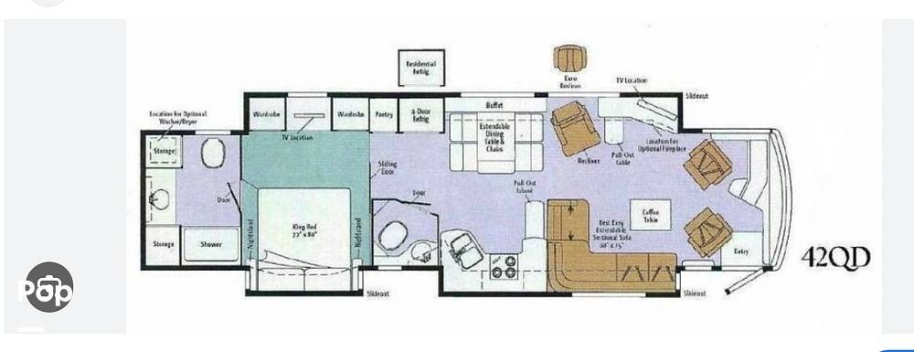 Inside, you'll find a spacious layout that comfortably sleeps four people. The master bedroom features a cozy queen-sized bed, while the living area has a convertible sofa for your guests. The kitchen is fully equipped with a fridge, microwave, and stove, making it easy to whip up your favorite meals on the go. Plus, there's plenty of storage space for all your travel essentials. The bathroom is roomy too, with a full shower and all the comforts of home.