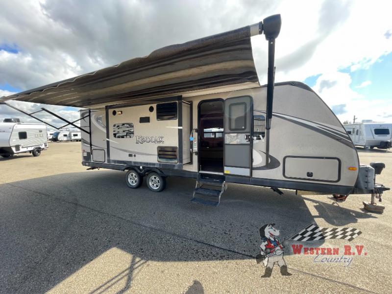 The Kodiak 279RBSL features two slide-outs, significantly enhancing the living space and providing a roomy interior that can comfortably sleep up to five people. The intelligently designed floor plan includes a cozy sleeping area, a fully-equipped kitchen, and a welcoming living space, making it perfect for both short getaways and extended trips. The kitchen is outfitted with essential appliances and ample storage, ensuring you have everything you need to prepare meals on the go. The living area is designed for relaxation, offering comfortable seating and entertainment options to unwind after a day of exploration.