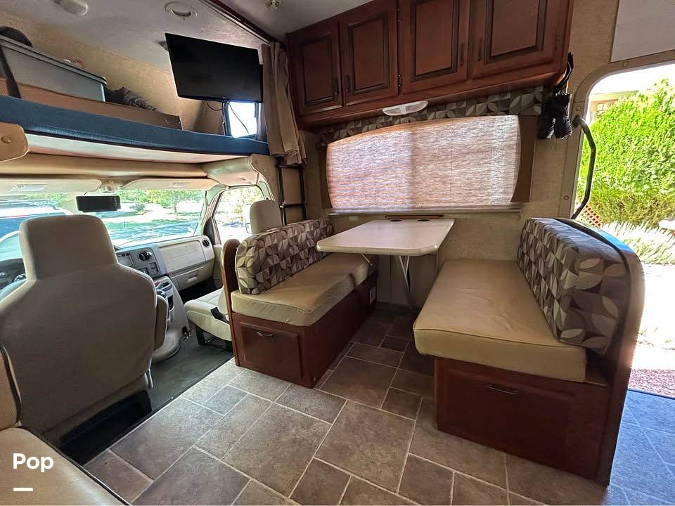 Step inside to discover a well-appointed living area featuring high-quality furnishings and finishes. The spacious layout includes a fully equipped kitchen with a refrigerator, microwave, and three-burner stove, making meal preparation a breeze. The dining area provides a comfortable space for enjoying meals together, while the living area is perfect for relaxation, complete with a flat-screen TV and entertainment system. The Sunseeker's intelligent design ensures that every inch of space is utilized efficiently, offering plenty of storage options for all your travel essentials.