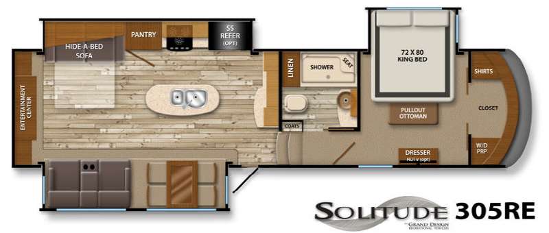 Featuring three slide-outs, the Solitude 305RE maximizes interior space, providing a roomy living area that can comfortably sleep up to four people. The thoughtfully designed layout includes a cozy living room with plush seating and a flat-screen TV, creating a perfect space for unwinding after a day of exploration. The fully equipped kitchen boasts modern appliances and plenty of storage, allowing you to prepare meals with ease. The inviting bedroom offers a restful retreat, complete with a comfortable bed and additional storage.
