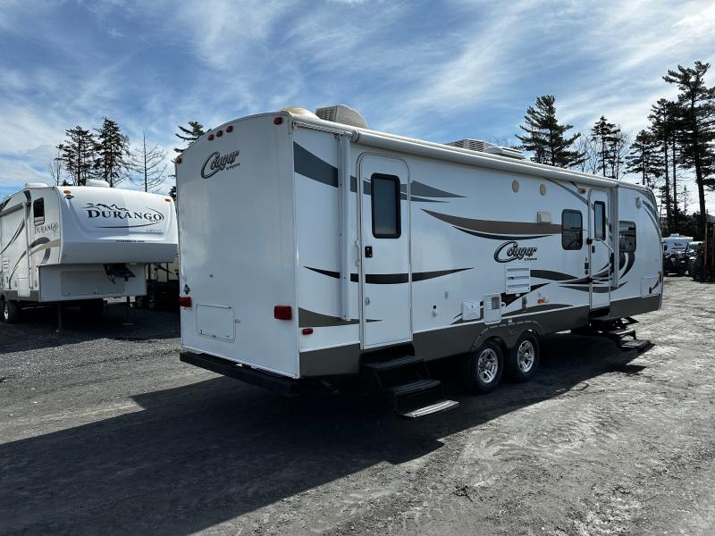 Step inside, and you'll be greeted by a warm and inviting interior that can comfortably accommodate your loved ones. The Cougar 28RBH features a smart layout with a cozy living area, a fully-equipped kitchen, and a dining space that invites you to share meals and stories. The bunkhouse design is perfect for families, offering dedicated sleeping quarters for the kids, while the master bedroom provides a private retreat for the adults. With ample storage throughout, you can bring along all your essentials and more.