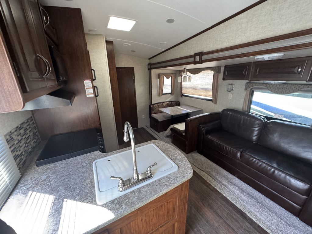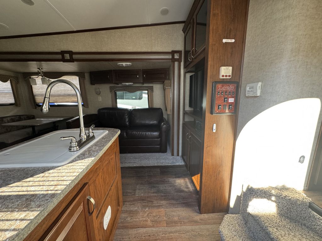 Step inside to find a thoughtfully designed interior that maximizes space and functionality. The Laredo 280SBH features a spacious living area with comfortable seating, perfect for relaxing after a day of exploration. The kitchen is equipped with modern appliances and ample storage, allowing you to prepare meals with ease. The sleeping quarters include a cozy master bedroom and additional bunk beds, providing comfortable accommodations for family or friends.