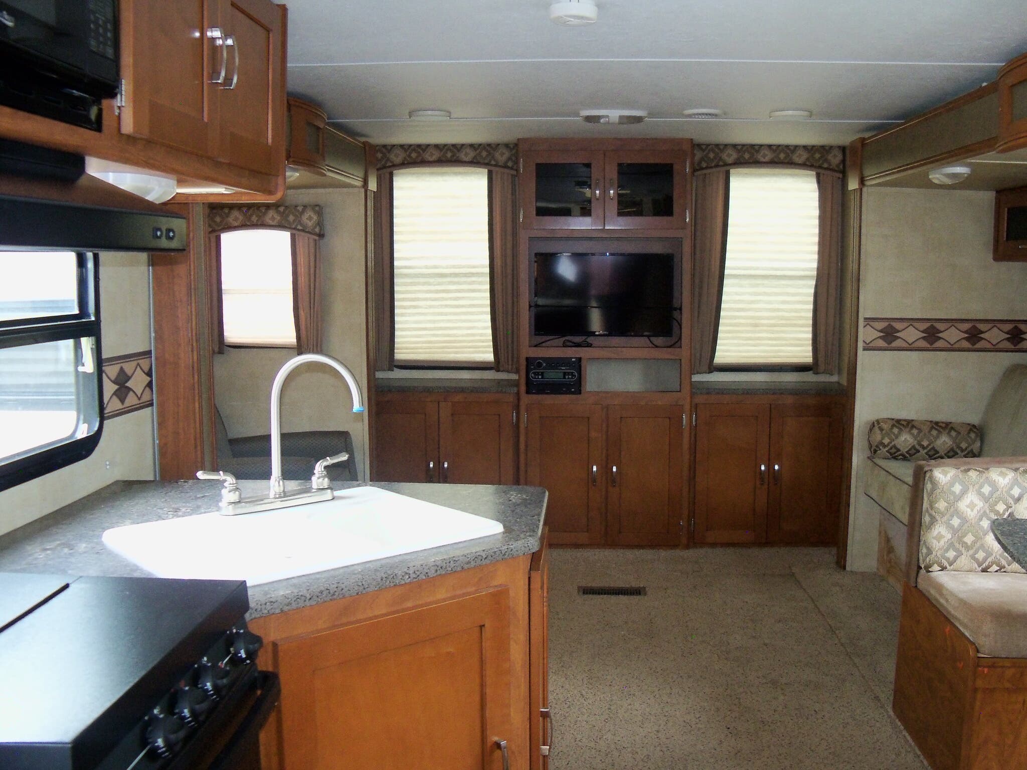 Step inside to find a thoughtfully designed interior that can comfortably sleep up to six people. The two slide-outs create a roomy living area, perfect for family gatherings or entertaining friends. The well-equipped kitchen features modern appliances, ample counter space, and plenty of storage, ensuring you can prepare meals with ease. The cozy sleeping quarters and a convertible dinette provide flexible sleeping arrangements, while the inviting lounge area is perfect for relaxing after a day of adventure.