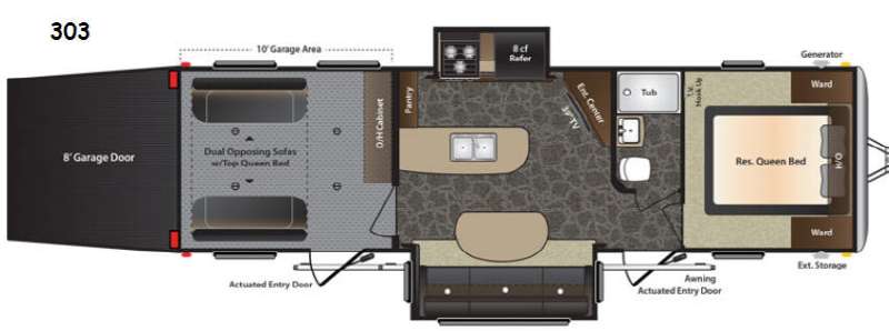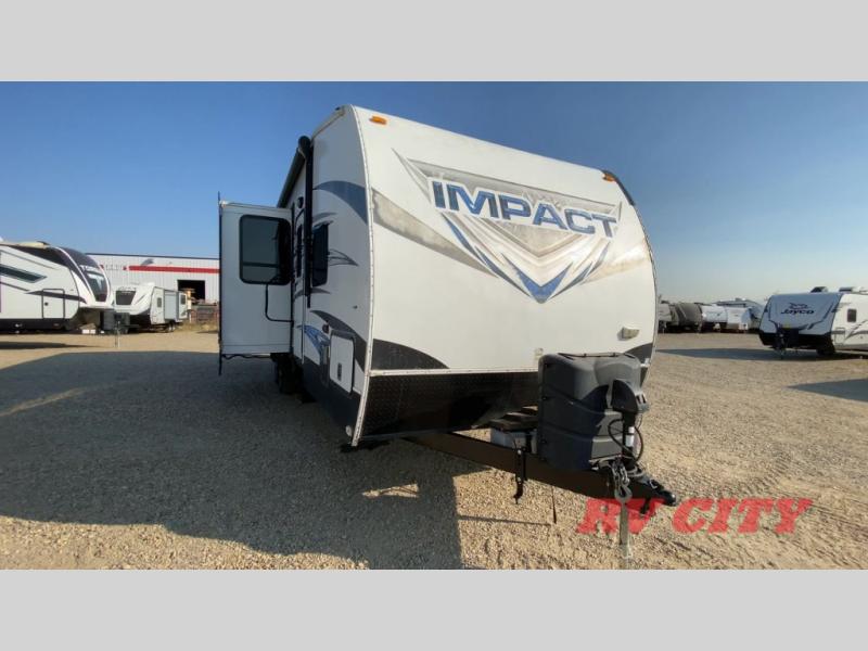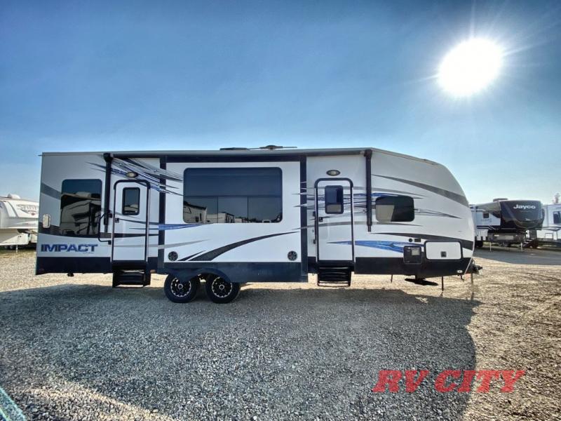 Measuring approximately 28 feet in length, the Impact 303 is compact enough for easy maneuverability yet spacious enough to accommodate up to seven sleepers. The interior layout is thoughtfully designed to maximize space and functionality, featuring a cozy living area, a fully-equipped kitchen, and a versatile garage space that doubles as additional sleeping quarters or storage for your outdoor gear. Whether you're traveling with family or friends, everyone will find their own space to relax and unwind.
