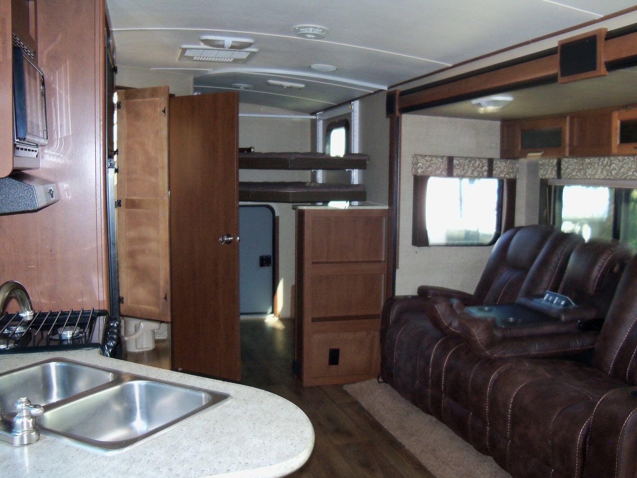 The Aerolite 282DBHS features a single slide-out that significantly enhances the living space, offering a roomy interior for relaxation and entertainment. Inside, you'll find a well-appointed kitchen equipped with modern appliances, ample counter space, and plenty of storage, making meal preparation a breeze. The cozy living area is perfect for unwinding after a day of exploration, with comfortable seating and a versatile dining area that can easily convert to additional sleeping space.