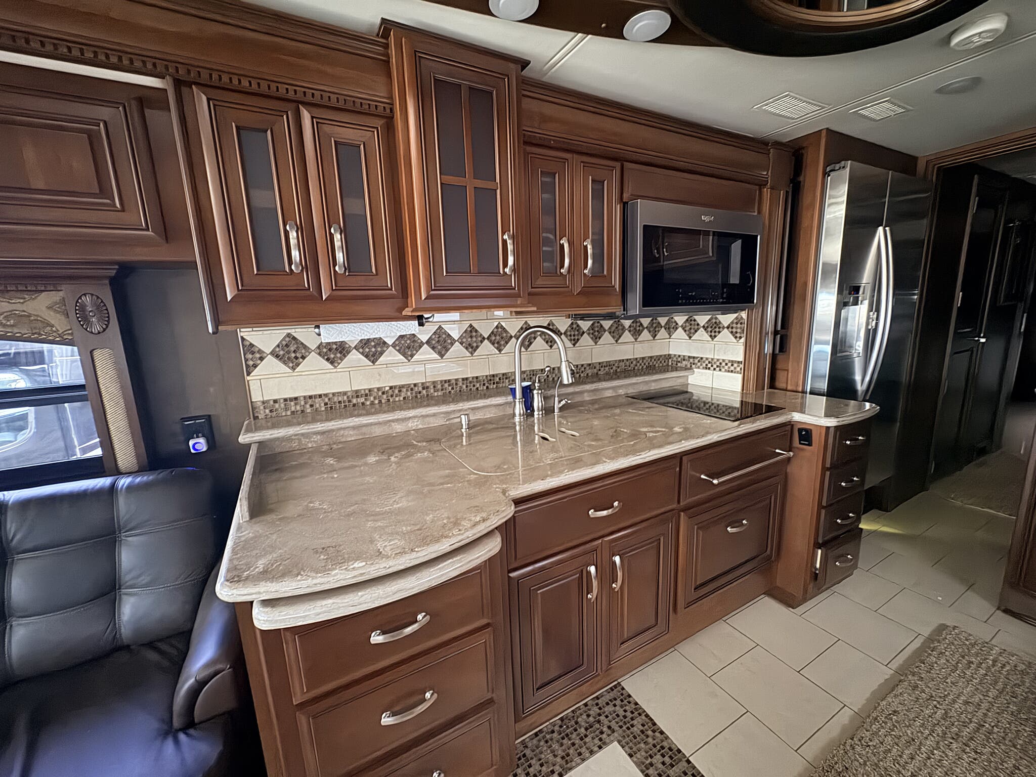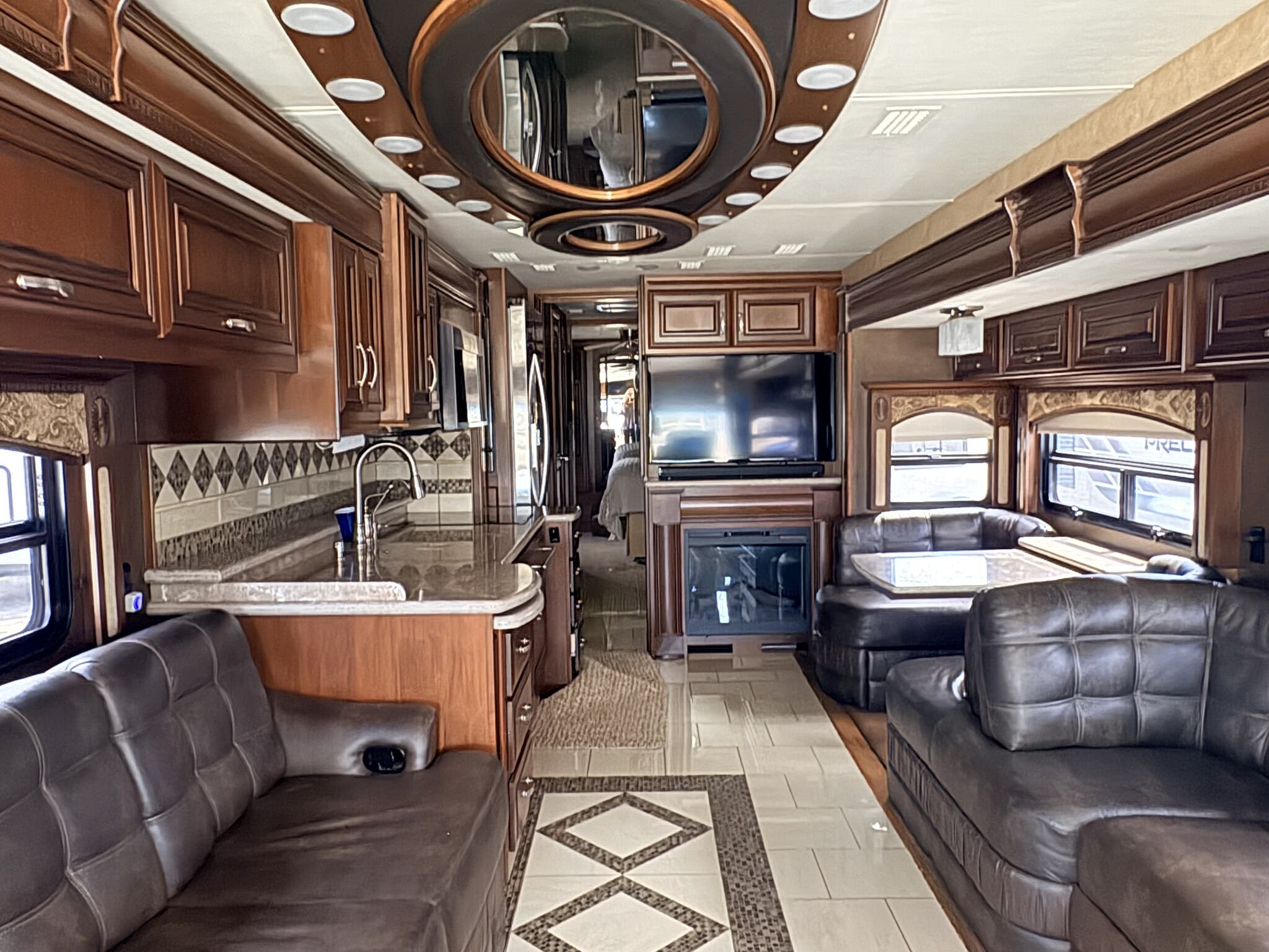 Equipped with four slide-outs, this RV provides an expansive living space that rivals any home. The interior is thoughtfully designed with high-quality finishes and modern amenities, ensuring a luxurious experience. The kitchen is fully equipped with top-of-the-line appliances, perfect for preparing meals on the go. The living area features plush seating and entertainment options, making it an ideal space for relaxation after a day of exploration. The sleeping quarters are equally impressive, offering restful nights with comfortable bedding and ample storage.