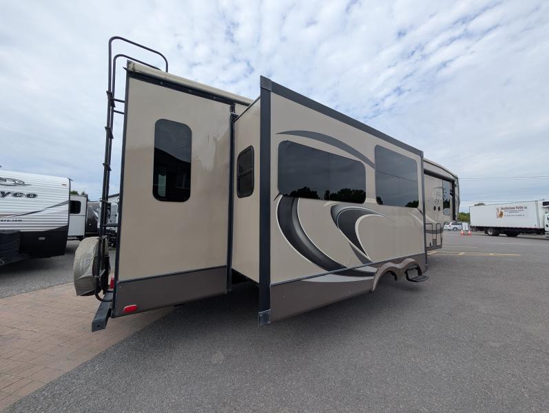 The Heartland Gateway 3200RS also boasts a well-appointed master bedroom with a comfortable queen-sized bed and ample wardrobe space, ensuring restful nights on the road. The bathroom is designed with practicality in mind, featuring a spacious shower and high-quality fixtures. Additional features include climate control, ensuring comfort in any weather, and a robust construction that promises durability and reliability. Whether you’re a seasoned traveler or new to the RV lifestyle, this fifth wheel offers a perfect blend of luxury and practicality, making it a wise investment for your future adventures.