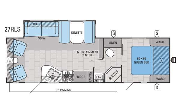 The Jay Flight 27RLS features a single slide-out that significantly enhances the living area, creating a spacious and inviting environment. Inside, you'll find accommodations to comfortably sleep four people, making it perfect for small families or couples seeking a getaway. The interior is thoughtfully designed with quality furnishings and finishes, ensuring a cozy and functional living space. The kitchen is equipped with modern appliances, allowing you to prepare meals with ease, while the living area provides a relaxing space to unwind after a day of adventure.