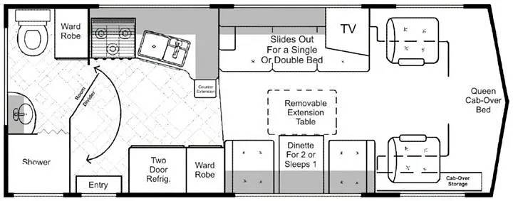 Step inside to find a thoughtfully designed interior that maximizes space and functionality. The living area features plush seating and a convertible dinette, providing a cozy spot for meals or relaxation. The well-equipped kitchen boasts a refrigerator, stove, and ample storage, making meal prep a breeze. The sleeping arrangements include a comfortable double bed and an overhead bunk, ensuring everyone has a restful night’s sleep. The bathroom is complete with a shower, sink, and toilet, offering all the conveniences of home on the go.