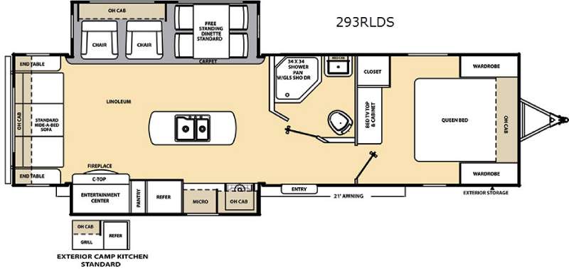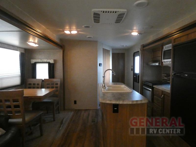The Catalina 293RLDS features two slide-outs, significantly expanding the living area to provide a spacious and inviting environment. Inside, you'll find comfortable sleeping accommodations for up to four people, ensuring restful nights after a day of adventure. The interior layout is thoughtfully designed, offering a cozy living room, a fully equipped kitchen, and a well-appointed bathroom. The kitchen comes with modern appliances, making meal preparation a breeze, whether you're cooking a quick breakfast or a gourmet dinner.
