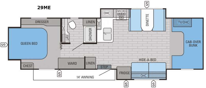 The Greyhawk 29ME comfortably sleeps six, making it perfect for family trips or getaways with friends. The thoughtfully designed layout includes a cozy sleeping area, a convertible dinette, and a sofa bed, ensuring restful nights for all. The kitchen is equipped with modern appliances, allowing you to prepare meals with ease, while the bathroom offers the convenience of home with a full shower and toilet.