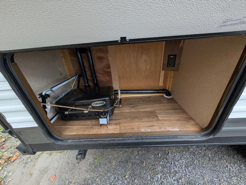The interior of this travel trailer is designed to maximize space and comfort, featuring a well-appointed living area with ample seating. The kitchen is equipped with modern appliances, including a refrigerator, microwave, and a three-burner stove, all designed to facilitate effortless meal preparation. The sleeping quarters offer a cozy retreat, with a queen-sized bed that ensures restful nights. The bathroom is equally impressive, featuring a spacious shower and high-quality fixtures, providing all the comforts of home while on the road.