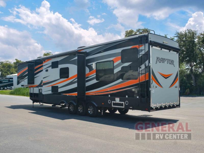This Raptor is equipped with two slide-outs, providing extra space for comfort and convenience. Whether you're hosting friends or enjoying a quiet night with family, this RV can comfortably sleep up to seven people. The interior is thoughtfully designed to maximize space and functionality, making it easy to enjoy meals, games, or just some downtime. The kitchen is well-appointed, and the living area is perfect for cozying up with a good book or movie.
