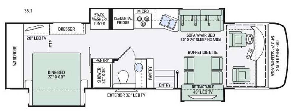 At 30 feet long, the Palazzo is spacious yet easy to maneuver, making it perfect for both seasoned RV enthusiasts and newcomers alike. Inside, you'll find a well-equipped kitchen with all the essentials, a comfy living area to kick back and relax, and a bathroom that feels just like home. The sleeping arrangements are versatile, with a master bedroom, convertible sofa, and a drop-down overhead bunk, ensuring everyone has a cozy spot to rest after a day of exploring.