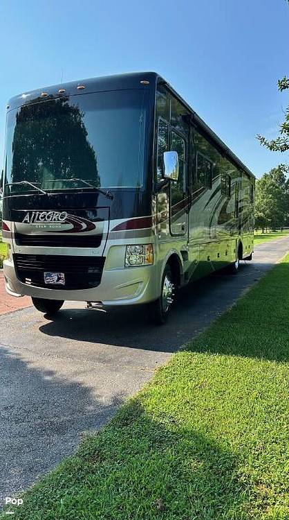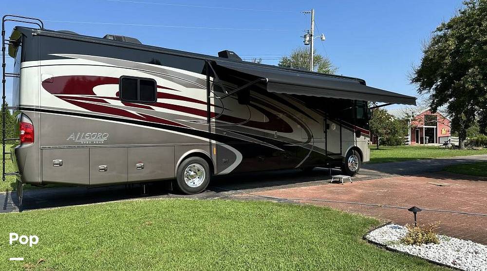 Step inside to discover a thoughtfully designed living area featuring high-quality furnishings and finishes. The Allegro Open Road 36LA boasts a fully equipped kitchen with modern appliances, including a refrigerator, microwave, and stove, all set within a stylish and functional layout. The living space is enhanced by a cozy seating area, perfect for relaxation or entertaining guests. The RV also includes a well-appointed bathroom with a shower, ensuring all the comforts of home are always within reach.