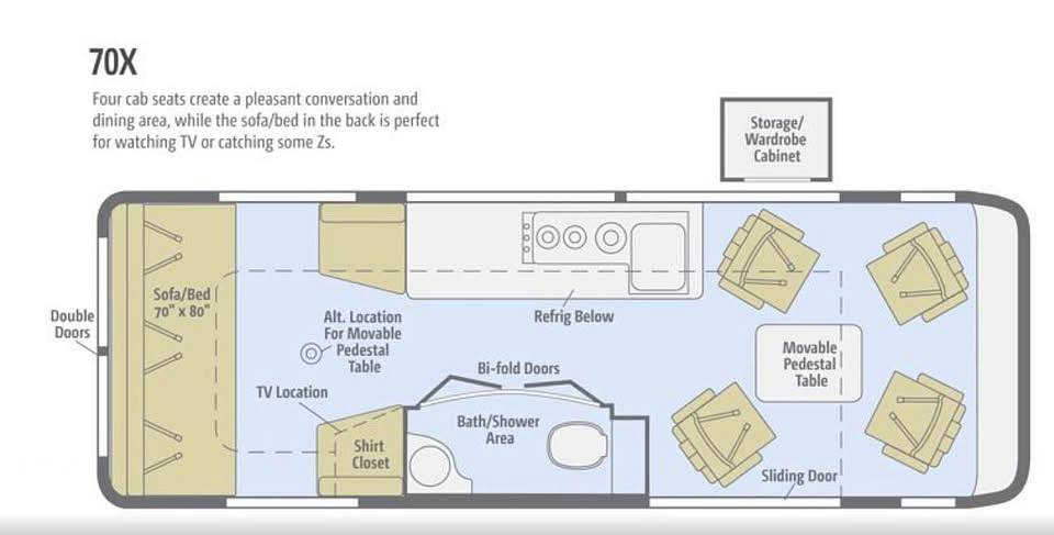 Inside, you'll find a well-appointed interior featuring a fully equipped kitchenette with a refrigerator, microwave, and two-burner stove, allowing you to prepare meals with ease. The seating area is designed for relaxation and can be converted into comfortable sleeping quarters, ensuring a restful night's sleep. The RV also includes a compact bathroom with a shower, providing all the essentials for a comfortable journey.