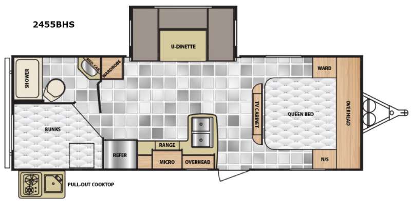 The Minnie 2455 BHS features a single slide-out, which significantly enhances the living area, providing a spacious and inviting environment for relaxation and entertainment. The intelligently designed interior includes a well-equipped kitchen, a cozy dining area, and comfortable sleeping arrangements, ensuring that all your needs are met while on the road. The trailer's weight of 2,415 kilograms ensures stability and ease of towing, making it suitable for a variety of vehicles.