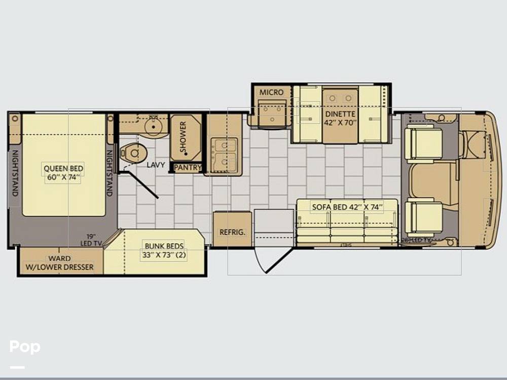 Inside, you'll find all the comforts of home. The layout is cleverly designed to maximize space and functionality, featuring a cozy living area, a fully equipped kitchen, and a bathroom with all the essentials. The sleeping arrangements are versatile, with a mix of beds and convertible spaces to suit everyone’s needs. Whether you’re cooking up a storm or just relaxing after a day of exploring, this RV has got you covered.