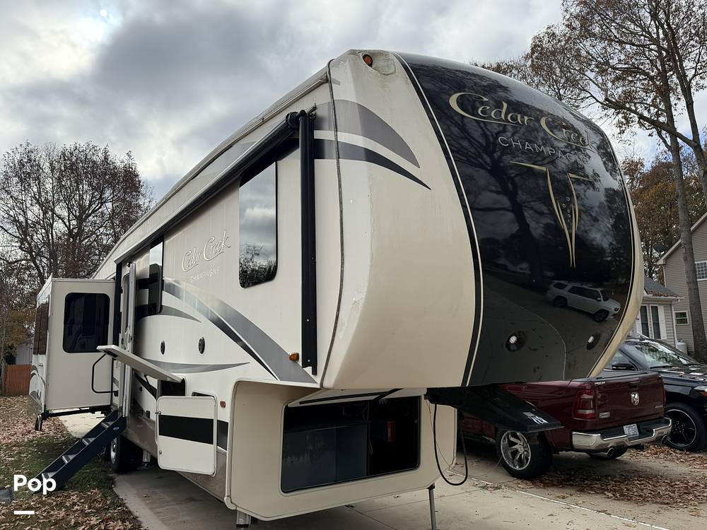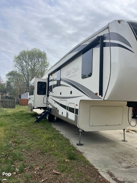 Discover the perfect blend of luxury and adventure with the 2017 Forest River Cedar Creek Champagne 38EL Fifth Wheel. This stunning RV is your ticket to exploring the great outdoors without sacrificing the comforts of home. With a length of 35 feet, this spacious haven is designed to accommodate up to four people, making it ideal for family getaways or a cozy retreat with friends.