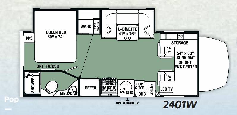 Equipped with a fuel capacity of 91 liters, this RV ensures you can travel longer distances with fewer stops, allowing you to focus on the journey ahead. The Forester 2401W features a well-appointed interior with sleeping arrangements that include a cozy overhead bunk, a convertible dinette, and a comfortable rear bed. The kitchen is fully equipped with modern appliances, including a refrigerator, microwave, and stove, making meal preparation a breeze wherever you are.