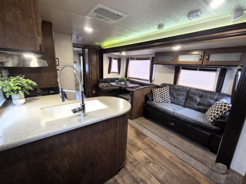 The Wildwood 28CKDS features two expansive slide-outs, significantly enhancing the living space and providing ample room for relaxation and entertainment. Designed to accommodate up to eight people, this RV is ideal for family vacations or group adventures. The intelligently designed floor plan includes a master bedroom, a convertible dinette, a cozy sofa, and bunk beds, ensuring everyone has a comfortable place to rest after a day of exploration.