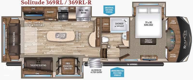 Inside, the Solitude 369RL comfortably accommodates up to four guests, making it perfect for families or couples seeking a home away from home. The interior is thoughtfully designed with high-quality finishes and modern amenities, including a fully equipped kitchen with premium appliances, a cozy living area with plush seating, and a sophisticated dining space. The master suite features a queen-sized bed, offering a restful sanctuary after a day of exploration. Additionally, the RV is equipped with a spacious bathroom, complete with a shower and ample storage.
