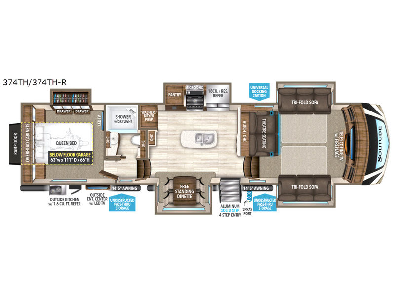 Weighing in at 7,024 kilograms, this Fifth Wheel is built for durability and ease of towing. Whether you're embarking on a cross-country journey or setting up camp at your favorite spot, the Grand Design Solitude 374TH is engineered to deliver a smooth and reliable ride. Experience the freedom of the open road with this exceptional RV, where every journey becomes a memorable adventure. Don't miss the opportunity to own a piece of luxury on wheels—contact us today to learn more or schedule a viewing.