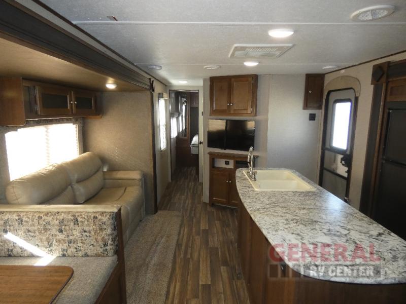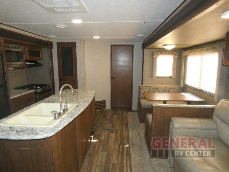 Step inside and be greeted by a welcoming interior that boasts two convenient slide-outs, offering ample space for everyone to relax and enjoy. Whether you're planning a family vacation or a weekend escape with friends, this travel trailer comfortably sleeps up to eight people. The thoughtfully designed layout includes a cozy master bedroom, a bunkhouse for the kids or guests, and a versatile living area that transforms into additional sleeping space. The well-equipped kitchen features modern appliances, ensuring you can whip up your favorite meals no matter where the road takes you.