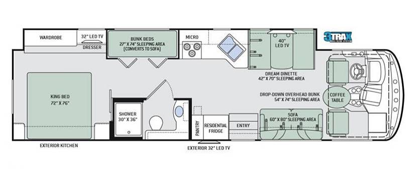 Equipped with a generous fuel capacity of 303 liters, the Hurricane 34J ensures you can travel long distances with fewer stops, allowing you to focus on the journey ahead. Inside, you'll find a well-appointed interior featuring a fully equipped kitchen, comfortable sleeping arrangements, and a cozy living area. The RV includes modern amenities such as a flat-screen TV, ample storage, and a bathroom with a shower, ensuring you have all the comforts of home while exploring the great outdoors.
