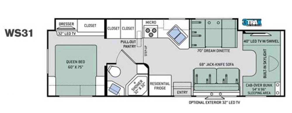 Inside, you'll find room to sleep up to 10 people comfortably, making it ideal for family trips or a getaway with friends. The well-designed interior features a cozy living area, a fully-equipped kitchen, and a bathroom with all the essentials. The sleeping arrangements include a comfy queen bed, a convertible dinette, a sofa bed, and a convenient overhead bunk. Plus, with plenty of storage space, you can bring along all your gear and essentials without a hitch.