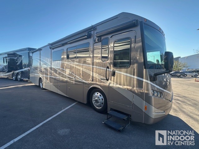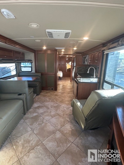 Step inside to experience the spaciousness provided by three slide-outs, which significantly expand the living area, creating a home-like atmosphere wherever you park. The interior is thoughtfully designed with high-quality finishes and modern amenities, ensuring you travel in style. The well-equipped kitchen features top-of-the-line appliances, making meal preparation a breeze. Relax in the plush seating area, or retreat to the private master bedroom, complete with a comfortable bed and ample storage.